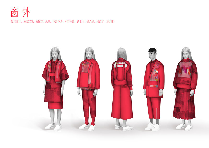 作品闡述;本系列運(yùn)用如巖漿般的紅色為主色系純粹又明快,這種色調(diào)以一種精力充沛,富有靈動(dòng)性又兼具潮流感。廓形向長(zhǎng)款和疊搭式廓形轉(zhuǎn)變,不對(duì)稱和富有層次的細(xì)節(jié)設(shè)計(jì),運(yùn)用解構(gòu)主義剪裁,全新的形狀通過(guò)折疊,垂墜,斜裁的纏裹解構(gòu),寬松簡(jiǎn)潔的后背設(shè)計(jì),運(yùn)用塑膠材質(zhì)pvc精致的壓印增強(qiáng)服裝的視覺效果。