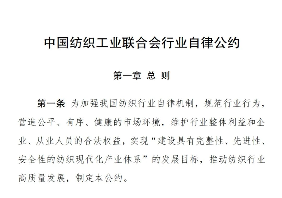 ![]() 2024年7月,為加強紡織行業自律機制,規范行業行為,營造公平、有序、健康的市場環境,維護行業整體利益和企業、從業人員的合法權益,實現“建設具有完整性、先進性、安全性的紡織現代化產業體系”的發展目標,推動紡織行業高質量發展,中國紡織工業聯合會第五屆第五次常務理事會審議通過并發布了《中國紡織工業聯合會行業自律公約》。中國紡織工業聯合會會長孫瑞哲圍繞行業高質量發展明確提出:行業健康發展要強化行業自律。完善行規行約,引導行業自治自律,防止“內卷式”惡性競爭,營造更加公平、更有活力的市場環境。
