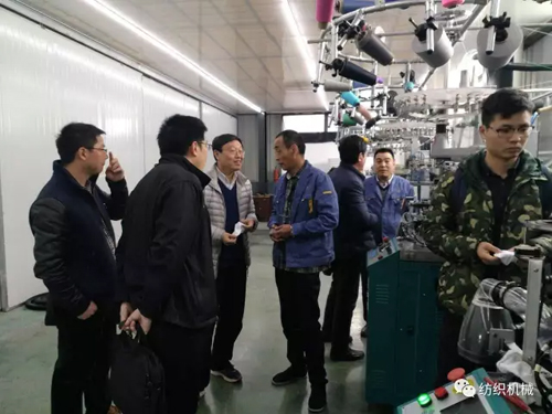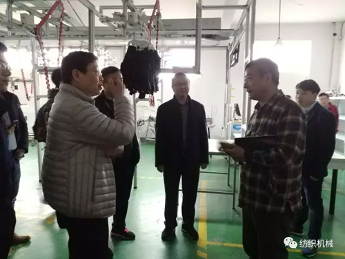 調(diào)研組在葉曉科技參觀終端產(chǎn)品。 在葉曉科技和偉煥機械,針對兩家襪機企業(yè)的產(chǎn)品銷售和技術創(chuàng)新情況進行了溝通。葉曉科技銷售常務副總顧曉東表示,作為浙江省級高新技術企業(yè),葉曉對襪機產(chǎn)品技術創(chuàng)新始終非常關注,已擁有多項專利,目前企業(yè)產(chǎn)值超一億元,出口遍及30多個國家和地區(qū)。作為浙江省機器換人項目參與企業(yè),該公司積極研發(fā)一步法襪機,現(xiàn)已在客戶試用,據(jù)介紹設備技術對于用戶提升效率,減少用工效果明顯。