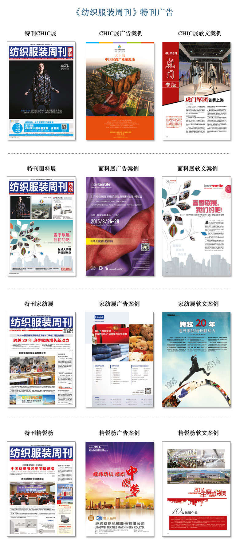 為更好地適應行業展會的發展需求,精準報道,深度剖析。《紡織服裝周刊》隆重推出了《展會特刊》,作為主辦方唯一指定官方刊物,憑借其權威平臺,可以鏈動有效資源,依其強大行業背景,能夠精準發行全館覆蓋。當期除在展館內發行外,還將通過發行渠道在全國發行。