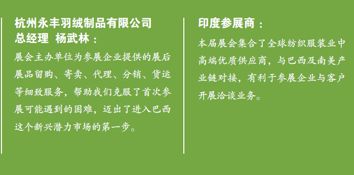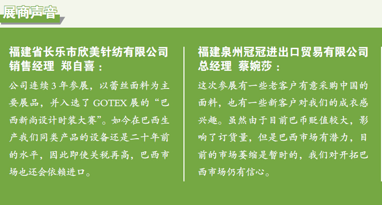 為了響應國內紡織服裝企業對開發巴西市場的熱情,滿足企業想把生意做到巴西以至拉美的需求,經過廣泛的市場調研,并與巴西當地行業協會進行了多次溝通,獲得廣泛共識和支持后,由中國國際貿易促進委員會紡織行業分會、中國紡織品進出口商會和中國-巴西投資貿易中心聯合主辦了巴西圣保羅GOTEX國際紡織服裝采購展。 GOTEX展是一個面向全球紡織品服裝供應商,按照全球供應鏈理念,與以巴西為中心的拉美紡織行業和市場全方位深度對接的專業貿易采購平臺,是目前在巴西舉辦的唯一對中國參展商開放的國際紡織品服裝專業采購展覽會,對國內紡織服裝企業開拓巴西、拉美市場發揮了重要作用。 受語言、距離、交通等客觀因素以及巴西國內消費文化、對外貿易制度、稅制等方面特殊性的影響,許多欲開拓巴西紡織市場的企業望而卻步。特別是今年以來,巴西經濟遭遇“寒冬”,更讓一些企業選擇了放棄。 機會永遠留給有準備的人。在一些企業選擇放棄的時候,那些具有開拓創新意識、有備而來的企業則賺得“盆滿缽滿”,他們乘興而來,滿意而歸。 正如連續三年參加GOTEX展的福建省長樂市欣美針紡有限公司銷售經理鄭自喜所言:“在巴西生產我們同類產品的設備還是二十年前的水平,因此即使關稅再高,巴西市場也還會依賴進口。產品有差異才能有競爭優勢。” 早退不是明智之舉 眾所周知,本屆展會正值巴西經濟持續不景氣,各項經濟指數全面下滑時期。根據巴西央行發布的《焦點調查》報告顯示,2015年巴西經濟增長預期將衰退2.55%,若該數據成真,2015年將是近25年來巴西經濟表現最差的一年。巴幣大幅貶值、震蕩提高了進口成本,增加了市場不確定性,這直接影響了部分采購商的到場參觀。 除了宏觀經濟因素,展會所在地——圣保羅國際會議展覽中心距離圣保羅Braz、Bom Retiro等紡織品集中的商業區距離較遠,客觀上也影響了部分觀眾的到場,尤其影響了對市場持觀望態度的這部分客戶的到場積極性。據了解,主辦單位選擇在圣保羅國際會議展覽中心辦展實屬無奈之舉,因為當時要考慮展期和巴西展館的實際可用日期,盡管做了多方準備,在附近地鐵站和展館之間安排了兩輛擺渡車循環接送觀眾,同時安排專人在地鐵站附近接應,但展館原定于6月份進行的裝修作業未能及時完工也在一定程度上影響了觀眾的到會數量。