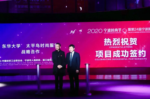 開幕式上,東華大學與寧波太平鳥時尚服飾股份有限公司簽署戰略合作協議,寧波大學、雅戈爾集團、申洲國際集團簽署寧波國際時尚科技園和寧波大學國際時尚學院戰略合作框架協議。中國服裝協會向太平鳥授予“中國當代青年時尚研究中心”稱號。 ![]() 東華大學校長、中國工程院院士俞建勇與太平鳥集團董事長張江平簽約。