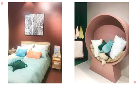 在14.2館B11 “年輕人的日與夜”主題展區,記者步入臥室這個“夜”空間,被深深吸引住了,整個空間簡約清透,清新時尚年輕又有些許俏皮,更具創意的是進門的櫥柜里擺滿了茶飲包裝,杯子里裝的可不是奶茶,全是枕套,如此有趣的設計究竟是哪個品牌呢?記者忍不住想一探究竟,當得知是國民老牌家紡南方寢飾時,不禁大吃一驚,好像與印象中的南方寢飾品牌差別很大。