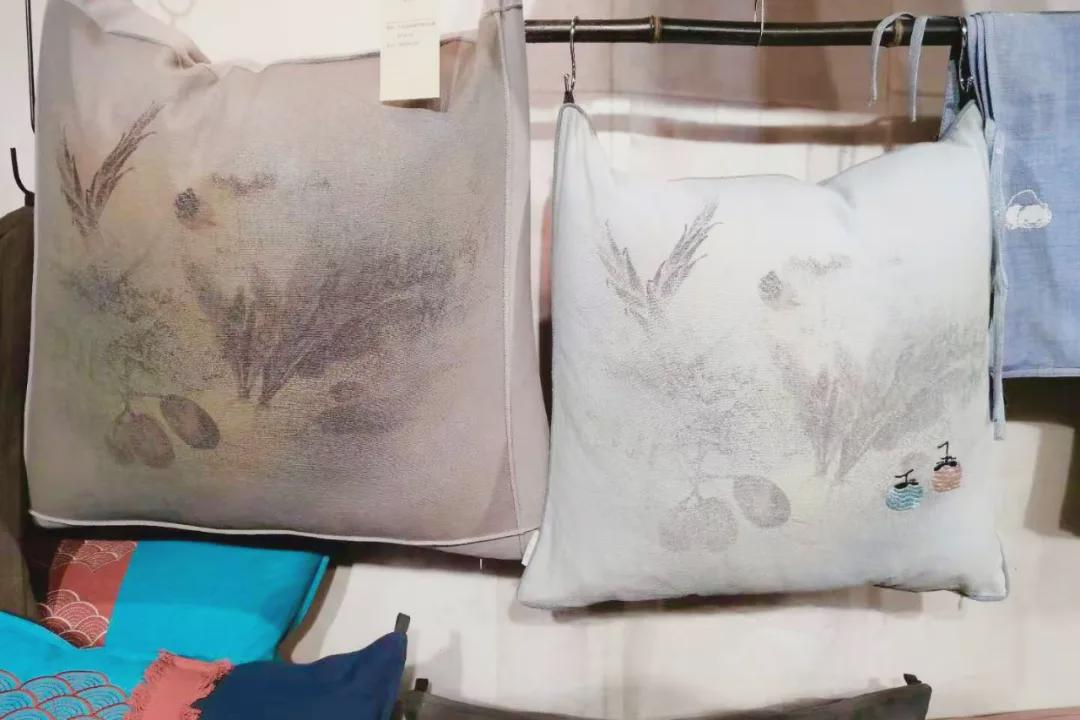 在眾多品牌齊聚的展會上想要脫穎而出,一定要有自己獨特的風格,南通通州區川姜鎮韻織家紡設計工作室展示了系列抱枕、靠包,坐墊、窗簾等產品,充滿禪意和韻味,其中【竹林七賢】產品系列,七色一組,用數碼印花展現竹林古韻,手繪七位隱士高人,山濤,嵇康,王戎等,系帶式外形沉穩大氣,充滿古意。四邊同類色澗線恰到好處的烘托出古韻與現代的結合。