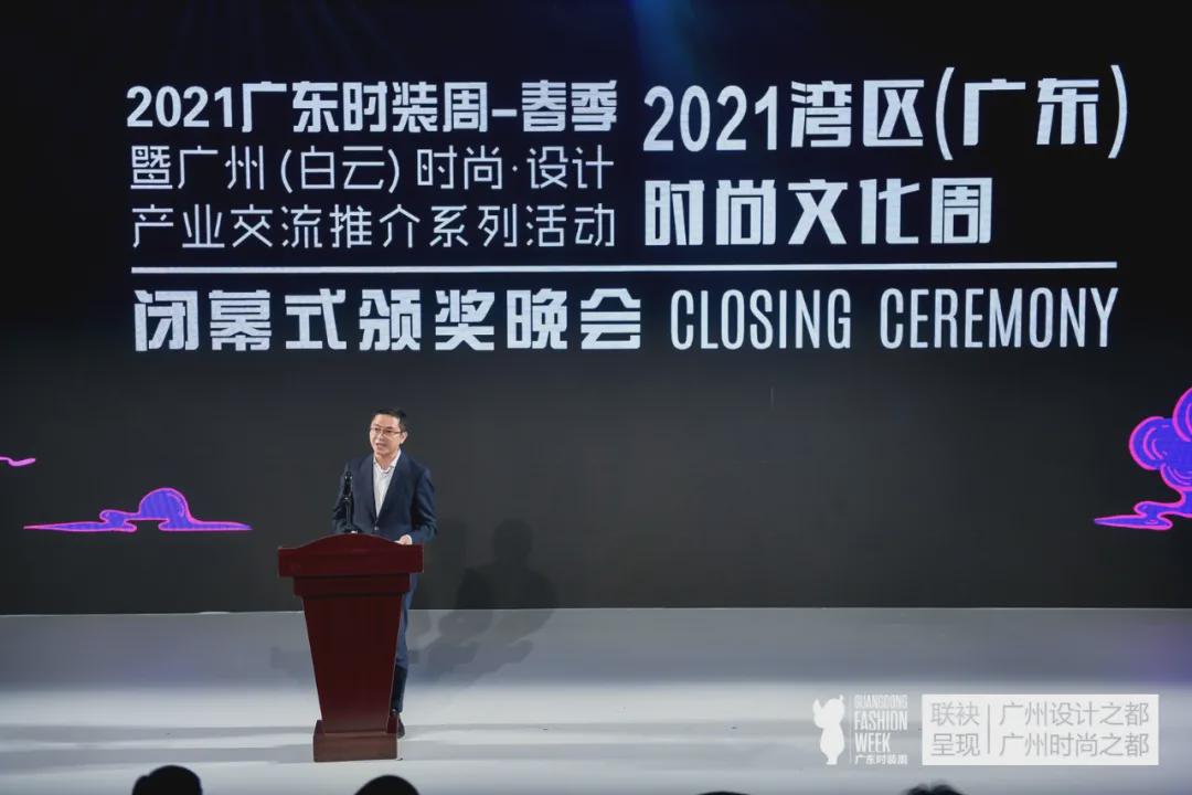 廣州市白云區人民政府副區長周軍為閉幕式致辭 8天時間里,共計106個時尚品牌、300余位設計師華麗亮相,時裝發布、創業大賽、時尚論壇、趨勢發布、商貿對接等30余場活動集中“綻放”,共計吸引了21,000余名專業觀眾赴現場觀摩、洽商。線下觀眾熱情高漲的同時,作為線上線下一體聯動的盛會,本屆廣東時裝周在線上聲量方面也可圈可點。據初步統計,截至23日晚,本屆廣東時裝周線上直播觀看總人次達6268.6萬,單場最高超過301.6萬人次,充分彰顯了廣東時裝周的強大影響力與輻射力。非遺創新品牌、非遺創新單位、非遺傳承單位、時尚引領卓越貢獻獎等非遺類獎項和產業推動獎、時尚品牌大獎等榮譽獎項在今晚一一揭曉。