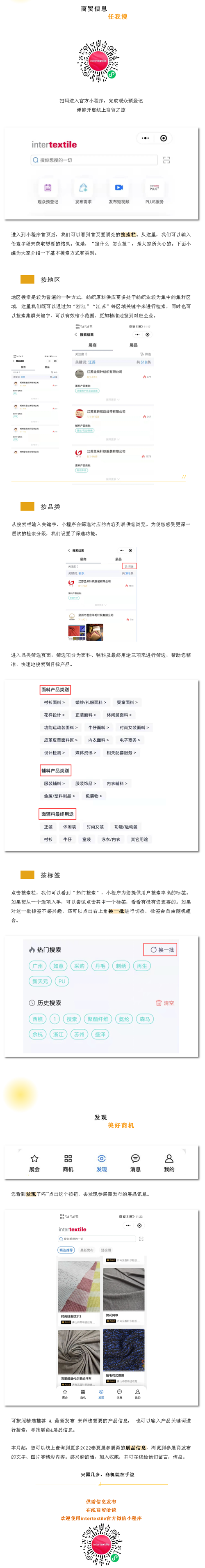 在intertextile面輔料展的PLUS數(shù)字化服務(wù)中,“官方小程序”作為線上服務(wù)工具,輕量化,操作簡便且商貿(mào)效果佳。作為intertextile的老粉和新晉粉絲,使用好小程序能為您帶來更好的參展以及觀展體驗(yàn)。目前,2022春夏展參展商線上展位已經(jīng)陸續(xù)搭建上線。這一期小編帶您詳細(xì)看看如何利用“官方小程序” 與他們“遇見”。