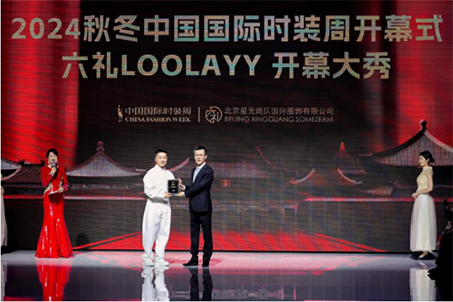 ![]() ![]() 在開幕儀式上,中國紡織工業聯合會副會長、中國服裝協會會長陳大鵬代表中國國際時裝周組委會,為北京星光尚仄國際服飾有限公司董事長張效奇頒發“2024秋冬中國國際時裝周開幕大秀榮譽紀念”牌匾。