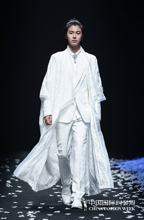![]() 開場男孩【王圣?!可碇蚁芍黝}定制禮服,設計師歷時2680個小時手工珠繡的高定創意禮服“無相之色·霜白”開篇出場,穩健的臺步頗具守護神之風、將男孩的勇敢、堅強、堅定的力量展現得淋漓盡致。