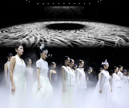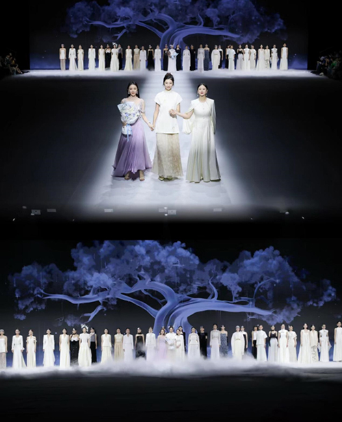 在整場(chǎng)秀中,品牌以白色締造了絕對(duì)安靜的環(huán)境,從白色的有限中觀察到世界無(wú)限運(yùn)動(dòng)的狀態(tài),從簡(jiǎn)單到復(fù)雜,再到去魅之后的真實(shí)。NUNU NONO『白上之白』以白色為始,從宇宙的浩瀚無(wú)垠之中誕生萬(wàn)物,順應(yīng)自然,呼應(yīng)“無(wú)為”的思想哲學(xué)核心——順應(yīng)自然規(guī)律。而后以大樹(shù)為背景致敬自然之美,將東方文化的精神核心通過(guò)傳統(tǒng)廣繡工藝躍然服裝表達(dá)之上,在場(chǎng)所有時(shí)尚人士、明星、各國(guó)使節(jié)夫人們無(wú)一不為其矚目。NUNU NONO還巧妙布局秀場(chǎng),通過(guò)音樂(lè)、薄霧光影、色彩變化等,講述關(guān)于人生「看山是山」、「看山不是山」到「看山還是山」三重境界的故事,營(yíng)造了一個(gè)充滿詩(shī)意與哲思的秀場(chǎng)氛圍。整個(gè)系列仿佛一場(chǎng)關(guān)于生命、自然與文化的對(duì)話,引導(dǎo)觀眾在視覺(jué)與心靈的雙重震撼中,重新審視東方美學(xué)的獨(dú)特價(jià)值。