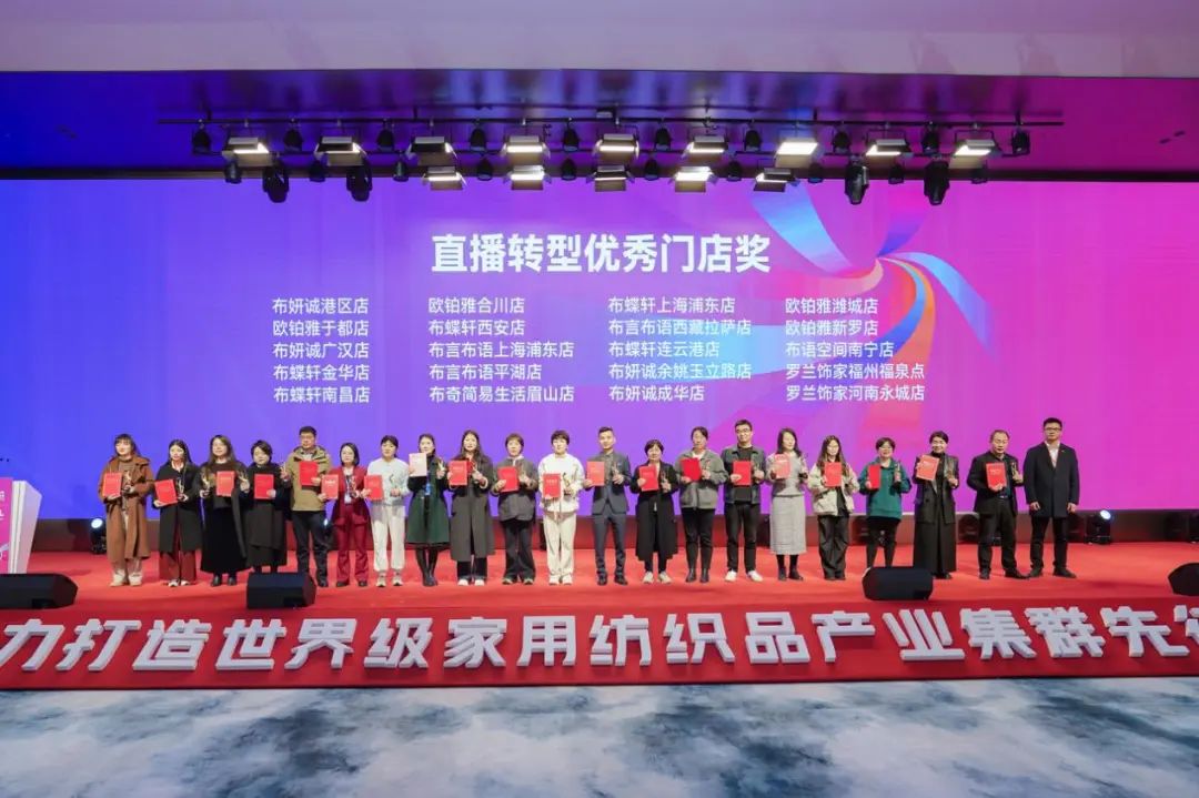 頒獎儀式上,布妍誠港區店、歐博雅于都店、布妍誠廣漢店、布蝶軒金華店、布蝶軒南昌店、歐博雅合川店、布蝶軒西安店、布言布語上海浦東店、布言布語平湖店、布奇簡易生活眉山店、布蝶軒上海浦東店、布言布語西藏拉薩店、布蝶軒連云港店、布妍誠余姚玉立路店、布妍誠成華店、歐鉑雅濰城店、歐鉑雅新羅店、布語空間南寧店、羅蘭飾家福州福泉店、羅蘭飾家河南永城店等20家門店榮獲“直播轉型優秀門店獎”;布妍誠、布奇、羅蘭世家、布言布語、新居樂、歐鉑雅、布蝶軒、非比尋常、天上人間、希布等10個品牌榮獲“2024年度成品窗簾互聯網十大影響力品牌”;海寧中國家紡城直播基地榮獲“賦能門店同城直播優秀機構獎”。