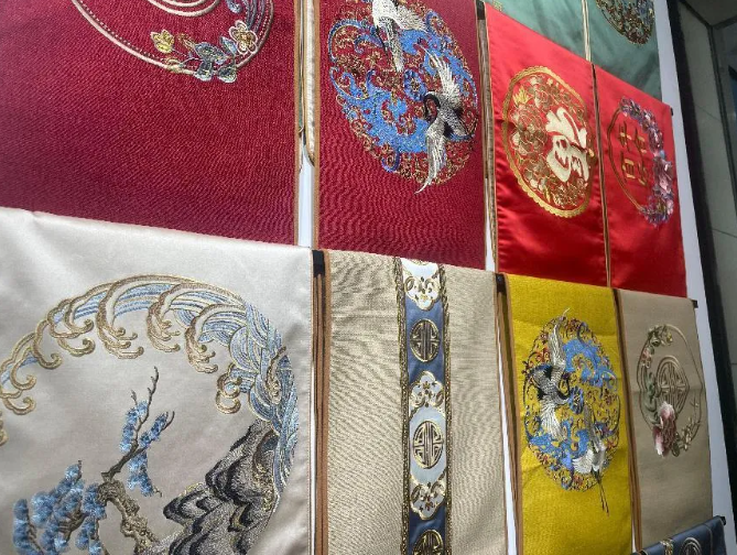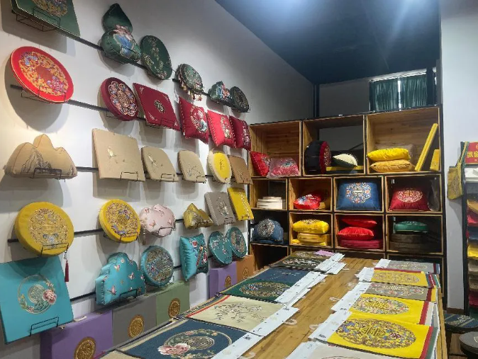 位于三號館(國貿中心)2樓的大唐夢成立于2015年,一直專注國潮風格產品的研發生產。2025年3月正式入駐海寧中國家紡城后,在春季家博會上憑借國潮風刺繡產品贏得不少新老客戶的青睞。“我們的客戶類型主要包括軟裝館、面料批發商、家具廠以及終端消費者,和消費者的鏈接則是通過線上淘寶店、抖音及淘寶直播。這幾年國風國潮類產品市場需求量年增長率高達20-30%,客戶群體也從原來的中年群體擴展至30歲左右的年輕人。為此,我們也開發了一系列年輕個性產品,如如意枕、靠山枕、葫蘆枕等,網紅直播單場就能售出300個;今年全新推出的一款包袋單場直播銷量500+,這次現場觀眾反饋也非常好。之后我們還會開發包包、ipad保護袋、電腦包等產品,相信可以獲得更多年輕客戶的喜愛。”大唐夢業務員盛麗琴在采訪中告訴我們。