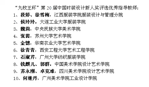 據(jù)統(tǒng)計,近年來隨著推薦優(yōu)秀畢業(yè)生參評的時裝院校逐年增加,“新人獎”評選累計接收全國時裝設(shè)計院校推薦的優(yōu)秀畢業(yè)生達(dá)8800人次,經(jīng)過激烈角逐與評選,共計655人次進入終評,其中164人獲得“新人獎”。“新人獎”不僅成為時裝設(shè)計專業(yè)大學(xué)生就業(yè)及自主創(chuàng)業(yè)的助推器,更成為促進時裝設(shè)計專業(yè)教育進步,檢驗高校時裝專業(yè)教學(xué)水平的標(biāo)桿,甚至影響著時裝專業(yè)教育和教學(xué)改革的發(fā)展方向。 “九牧王杯”第20屆中國時裝設(shè)計新人獎名單