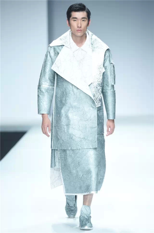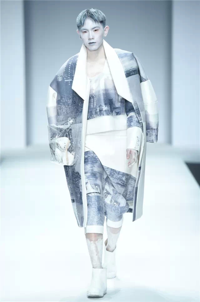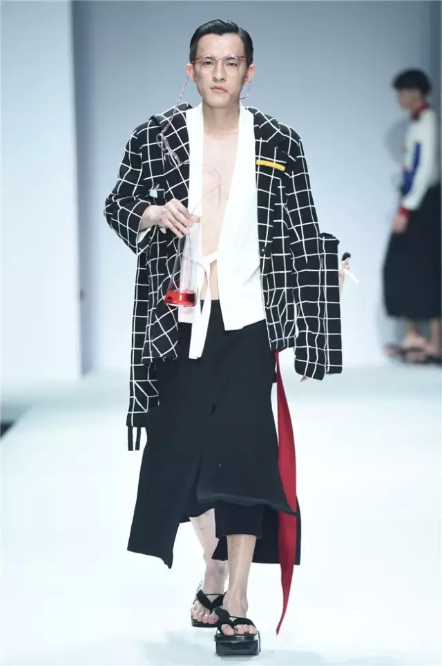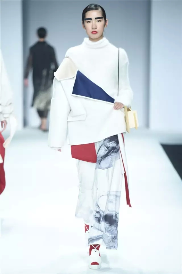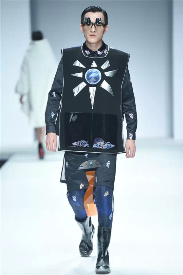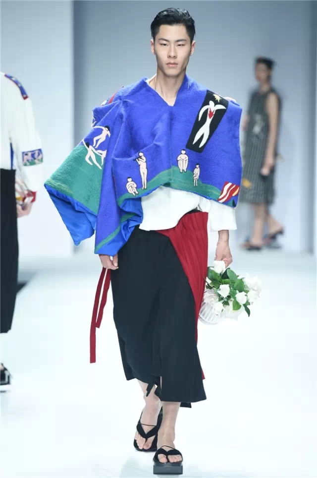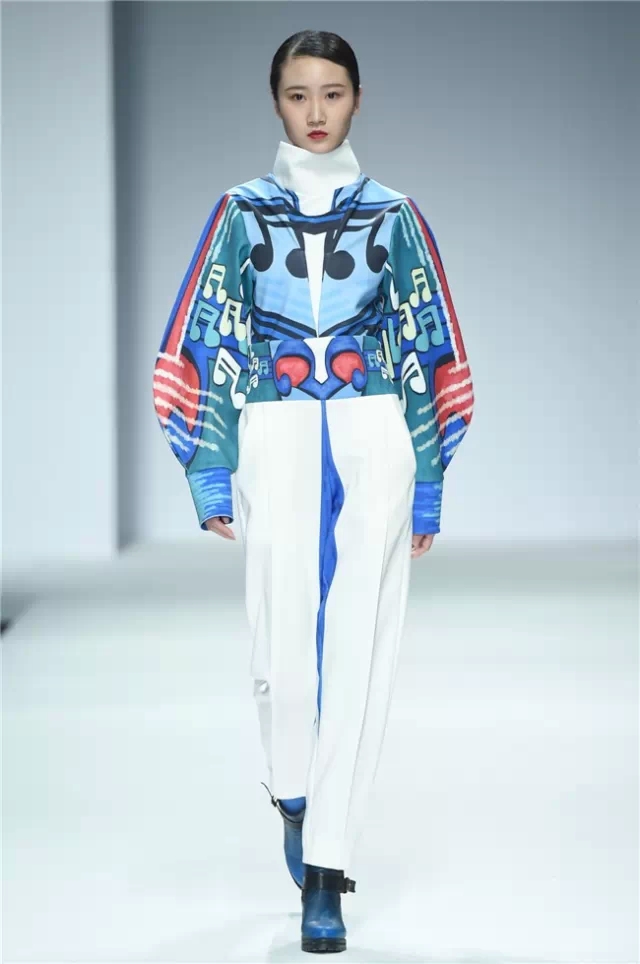 不拘泥于一種表現,而是呈現出更多元的設計創想,展示學生們對于服裝設計的理解。服裝的形態可以更多元,表達也可以更充分。 正如發布會的主題SHOW TIME,這是學生們無限創意的展示時刻。在不同篇章中,服裝設計有夸張且飽和度極高的幽默裝飾圖案,有不對稱剪裁的結構狂想,也有用抽象幾何、無規則線性拼接的波普圖案。經典被重塑、顛覆,在盛年錦時中奢華碰撞妖嬈,摩登遇見民族,浪漫邂逅柔美。 開場一群陽光青年在T臺上站定,動感音樂與創意的設計共同激發著觀眾的感官。之后的展現更像是靈感碰撞的花火,藍色毛線編織的斗篷、未來感十足的發光服飾……面料再造、不規則的拼接、鏤空的設計、精靈般的演繹,表達語言豐富精彩。壓軸出場的名為Verve Museum(熱情博物館)的設計靈感源自馬蒂斯的畫作,設計師以毛粘、針粘的方式表現日本風,藝術感十足。 本場服裝不僅偏向成衣化,同時更注重服裝與穿著者之間的情感紐帶,達到了藝術性和實用性的平衡。學生們在追求原創設計與張揚個性時,也沒有忽視對市場的平衡。(王賽)