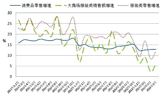 一二線市場(chǎng)增速放緩。根據(jù)中華全國(guó)商業(yè)信息中心統(tǒng)計(jì),2013年1~5月份,全國(guó)百家重點(diǎn)大型零售企業(yè)服裝類(lèi)商品零售額同比增長(zhǎng)5.79%,增速較2012年同期放緩4.8個(gè)百分點(diǎn)。各類(lèi)服裝零售量同比增長(zhǎng)1.33%,增速較2012年同期提高1.84個(gè)百分點(diǎn)。