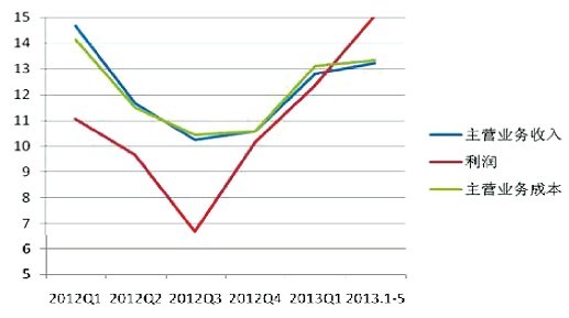 2013年1~5月,在廣東、福建、浙江、江蘇、山東東部5省中,僅福建和山東省規(guī)模以上企業(yè)銷(xiāo)售毛利率微增了0.16和0.23個(gè)百分點(diǎn),其余三省銷(xiāo)售毛利率增幅較去年同期均有微弱降幅。