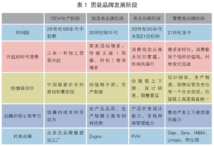 服裝品牌的發展有其共同的規律,不論是意大利、美國,還是法國品牌。從服裝行業上中下游價值鏈劃分的角度來看,中國男裝的品牌發展經歷了這樣幾個階段:OEM生產階段、制造商品牌階段、商業品牌階段和零售商品牌階段。