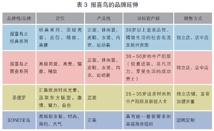 報喜鳥男裝也采用了品牌延伸的方式發展多品牌、多系列產品,進一步細分市場。目前公司旗下擁有多個品牌,如報喜鳥主品牌(SAINT ANGELO)、圣捷羅品牌(S.ANGELO)、寶鳥品牌(BONO)、B&Z、HAZZYS等。