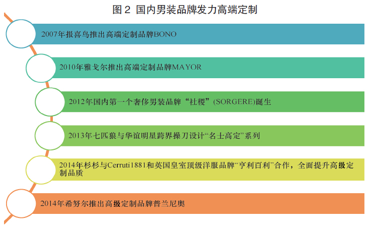 雅戈爾、波司登等中國知名男裝品牌都在其品牌下或多品牌中,推出了定位于高收入、高階層人士的高端定制系列,可見中國男裝品牌已認識到提升品牌價值、走高級定制道路是品牌建設的必然。在它們的帶動下,近年來國內男裝品牌頻頻發力高級定制。