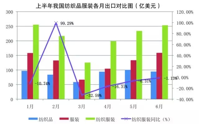 從今年上半年紡織服裝出口情況看,除1、2月受春節影響出口大幅波動外,3月起已經連續4個月下跌,但跌幅正不斷收窄,6月紡織服裝出口跌幅已收窄到1.13%。