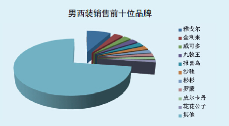 根據中華全國商業信息中心的統計,2015年7月,全國重點大型零售企業男西裝銷售前十位品牌市場綜合占有率合計達27.25%。雅戈爾、金利來和威可多占據前三位。