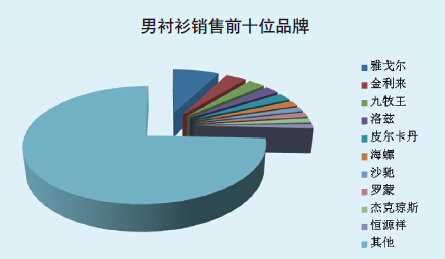 根據中華全國商業信息中心的統計,2015年7月,全國重點大型零售企業男襯衫銷售前十位品牌市場綜合占有率合計為25.64%,前三位依次是雅戈爾、金利來和九牧王。