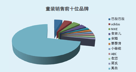根據中華全國商業信息中心的統計,2015年7月,全國重點大型零售企業童裝銷售前十位品牌市場綜合占有率合計為28.44%,其中,巴拉巴拉、adidas和NIKE占據前三位。