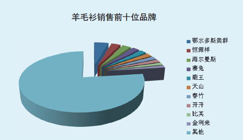 根據中華全國商業信息中心的統計,2015年7月,全國重點大型零售企業羊毛衫銷售前十位品牌市場綜合占有率合計為23.08%,其中,鄂爾多斯奧群、恒源祥和海爾曼斯占據前三位。