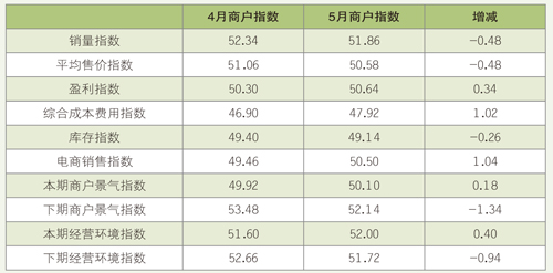 5月下期經營環境指數51.72,比4月的52.66下跌0.94個百分點;對下期行業總體經營環境持樂觀態度的商戶比例為33%,比4月的42%下降了9個百分點。