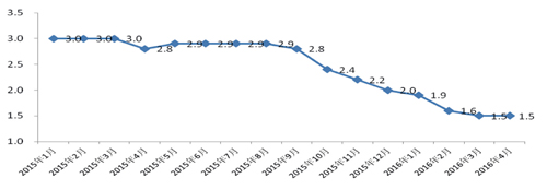 根據國家統計局的數據,2016年4月國內服裝類商品居民消費價格同比上漲1.5%,漲幅較上年同期回落1.5個百分點。