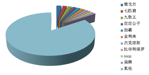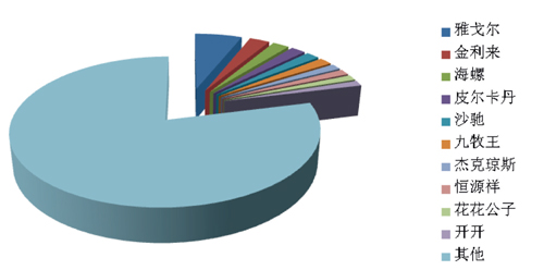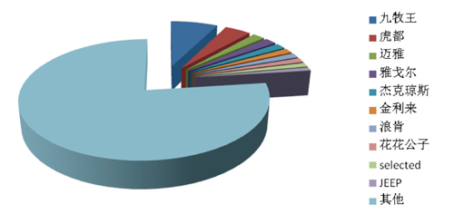根據中華全國商業信息中心的統計,2016年4月份全國重點大型零售企業男褲銷售前十位品牌市場綜合占有率合計為23.01%,前三位依次是九牧王、虎都和邁雅。