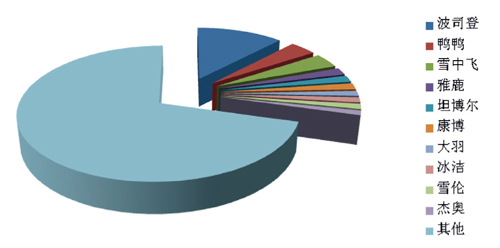 根據中華全國商業信息中心的統計,2016年4月,全國重點大型零售企業羽絨服銷售前十位品牌市場綜合占有率合計為29.38%,波司登、鴨鴨和雪中飛占據前三位。
