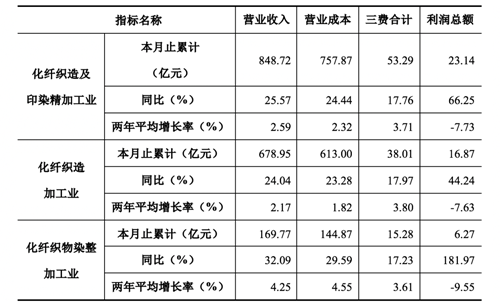 上半年,我國規上化纖織造及印染精加工業營業收入同比增長25.57%,兩年平均增長2.59%;利潤總額同比增長66.25%,兩年平均仍下降7.73%;利潤率為2.73%,較上年同期和今年一季度分別提高0.67和0.91個百分點。細分行業來看,化纖織造行業(規上)營業收入同比增長24.04%,兩年平均增長2.17%;利潤總額同比增長44.24%,兩年平均下降7.63%;利潤率為2.48%,較上年同期和今年一季度分別提高0.35和0.5個百分點。化纖染整行業(規上)營業收入同比增長32.09%,兩年平均增長4.25%;利潤總額同比增長181.97%,兩年仍平均下降9.55%;利潤率為3.7%,較上年同期和今年一季度分別提高1.96和2.55個百分點。