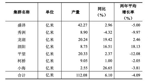 據各集群地區統計,2021年上半年,盛澤、秀洲、龍湖、泗陽、平望、柯橋、大豐小海七地化纖長絲織物產量累計為112.08億米,同比增長6.1%,生產形勢持續恢復,但受疫情和產業轉移等因素影響,仍未恢復到2019年同期水平,產量兩年平均下降4.09%。