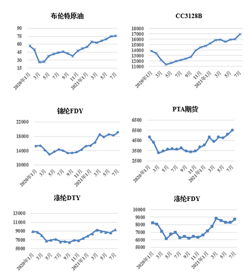 圖1 2020年1月~2021年7月我國化纖長絲、棉花及布倫特原油價格走勢圖