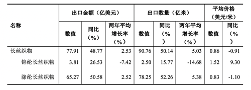 從出口價格來看,據中國海關統計,上半年我國化纖長絲織物出口平均價格為0.86美元/米,同比下降0.91%。今年上半年,原料價格大幅上漲,在這一壓力下,長絲織物出口價格不增反降,可以看出對外貿易的穩定主要維持在市場規模上,但總體盈利能力并不十分理想。