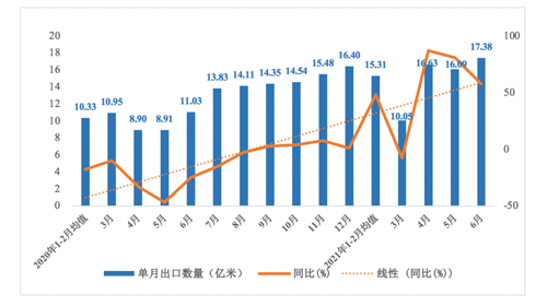 根據中國海關數據,2021年上半年,我國紡織品服裝累計出口額為1400.86億美元,同比增長12.06%,兩年平均增長6.2%。