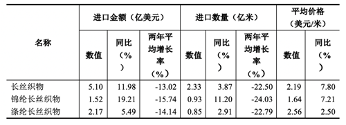 據我國海關統計,今年上半年我國長絲織物累計進口2.33億米,同比增長3.87%,兩年平均下降22.5%。其中,錦綸織物累計進口0.93億米,同比增長11.20%,兩年平均下降24.03%;滌綸織物累計進口0.85億米,同比增長2.91%,兩年平均下降22.79%。