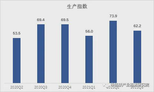 據測算,2021年三季度紡織行業生產指數為62.2,較二季度生產指數73.9的高位有所回調,但生產整體仍處于擴張區間。