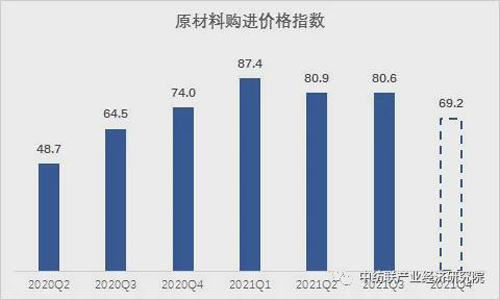 據測算,2021年三季度我國紡織行業原材料購進價格指數80.6,,比上期價格指數僅回落0.3個百分點,原料價格維持高位運行,對紡織企業經營壓力仍大。但從對四季度預期看,價格有下降趨勢,原材料價格指數或降到69.2。