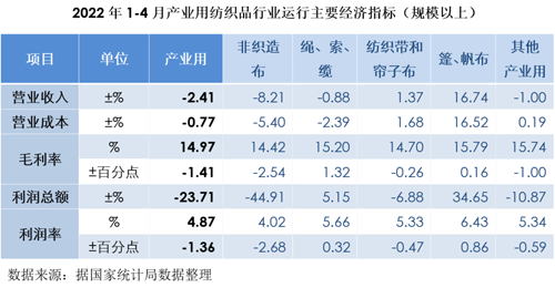 2022年1-4月,受疫情反復、結構成本上升等不利因素影響,產業用紡織品行業下行壓力加大,行業工業增加值繼續保持正增長,但增幅有所收窄。