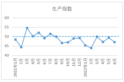 6月,生產指數為47.03,較5月下降2.44,降幅擴大。隨著產品庫存增加,部分企業(yè)開始限產放假,降低開臺,造成部分員工流失,產量出現下降。根據調研了解,大企業(yè)設備開臺率基本能維持在80%以上,中小企業(yè)開臺率不足80%,部分企開臺業(yè)甚至不足五成。從構成生產指數的各項指標看,設備開臺率指數環(huán)比下降2.39,紗產量指數環(huán)比下降2.04,布產量指數環(huán)比下降3.11。