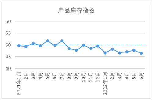 6月,原料庫存指數為48.46,與5月持平。當月,原料端價格變化加劇,下游市場采購熱情不高,除部分大企業(yè)原料庫存略有上漲外,其余企業(yè)棉花或非棉纖維庫存均較5月有所下降。同時,企業(yè)為穩(wěn)住資金鏈,保障生產經營持續(xù),謹慎管理原料庫存,合理控制原料庫存水平。從分項指數看,棉花庫存量指數47.71,較5月下降0.31;非棉纖維庫存量指數49.20,較5月上升0.29,仍低于枯榮線。