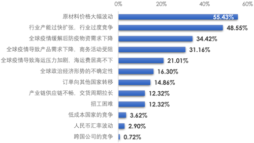 對于行業當前面臨的主要外部挑戰,受訪企業反映的問題主要集中在原材料價格的大幅波動和行業產能的過快擴張,此外,防疫物資需求下降、商務活動受阻和海運費居高不下也是企業反映較多的問題(表4)。受訪企業對來自低成本國家的競爭普遍持比較樂觀的態度,企業對自身的產品質量、客戶關系和創新能力有較強的信心,有信心和能力參與全球競爭。