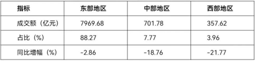 從區(qū)域結構看,1-9月,46家重點監(jiān)測市場中,東部地區(qū)專業(yè)市場成交額為7969.68億元,同比下降2.86%,占到專業(yè)市場總成交額的88.27%;中部地區(qū)專業(yè)市場成交額為701.78億元,同比下降18.76%,占到專業(yè)市場總成交額的7.77%;西部地區(qū)專業(yè)市場成交額為357.62億元,同比下降21.77%,占到專業(yè)市場總成交額的3.96%。