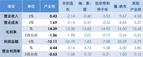 經濟效益方面,1-9月產業用紡織品行業規模以上企業的營業收入同比增長0.4%,自1-2月以來再次恢復增勢;利潤總額同比下降12.1%,營業利潤率為4.4%,同比下降0.6個百分點;行業虧損面為23.6%,虧損企業的虧損額同比增長23.1%。當前,原材料價格波動、需求支撐不足、市場競爭激烈等因素使行業的盈利能力仍然面臨挑戰。