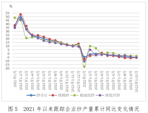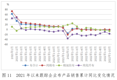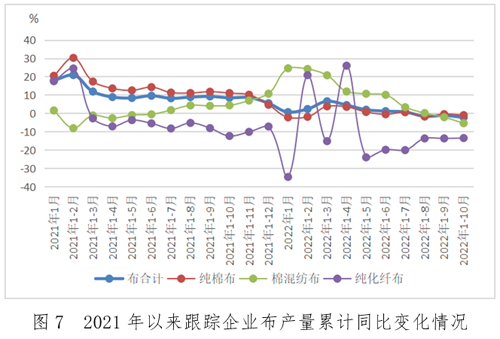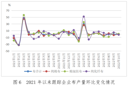 產量方面,集群企業各類紗線產量1-10月累計同比下降4.8%,其中規上企業累計同比下降4.9%;布產量累計同比增長4.4%,規上企業累計同比增長3.1%。