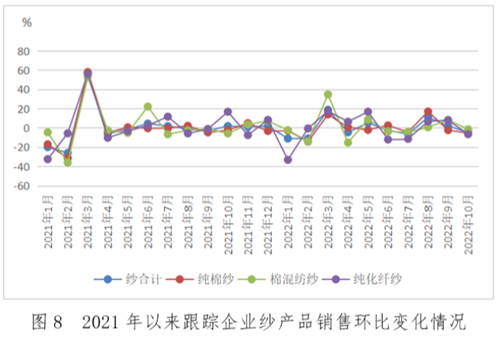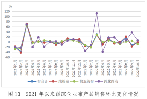 跟蹤數據顯示,10月紗銷售量環比下降5.01%,布銷售量環比下降2.61%,紗庫存環比下降1.8%,布庫存環比增長3.17%。10 月份,終端市場訂單下達不及預期,下游觀望為主,謹慎采購,采購備貨減少,布庫存累積增多。