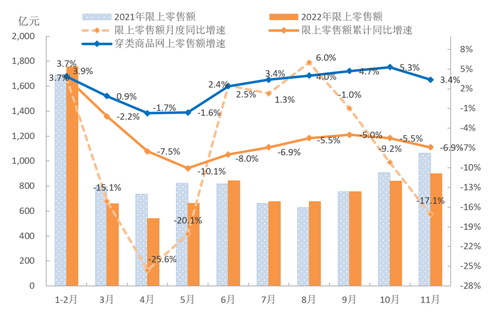 根據(jù)國家統(tǒng)計局數(shù)據(jù),2022年1-11月,我國限額以上單位服裝類商品零售額累計8294.6億元,同比下降6.9%,降幅比上半年收窄1.1個百分點,比2021年同期下滑23.3個百分點;11月當(dāng)月限額以上單位服裝類商品零售額同比下降17.1%。實體銷售大幅下降,根據(jù)中華全國商業(yè)信息中心統(tǒng)計,2022年1-11月,全國重點大型零售企業(yè)服裝零售額和零售量同比分別下降12.3%和16.2%,11月當(dāng)月服裝零售額和零售量同比分別下降29.0%和26.0%。線上服裝零售增速明顯放緩,2022年1-11月穿類商品網(wǎng)上零售額同比增長3.4%,增速比上半年加快1.0個百分點,比2021年同期放緩7.7個百分點。