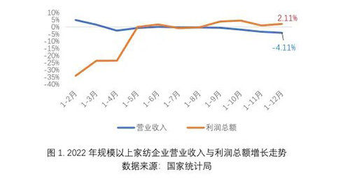 2022年,受到市場需求不足、國內疫情散發頻發等因素影響,家紡行業產銷規模較上年同比有所收縮。據國家統計局數據測算,規模以上家紡企業營業收入同比下降4.11%。行業技術改造轉型升級和成本控制初見成效,全年規模以上家紡企業營業成本和期間費用大幅減少,利潤保持了2.11%的小幅增長,行業總體承壓緩進,行業質效逐步改善。