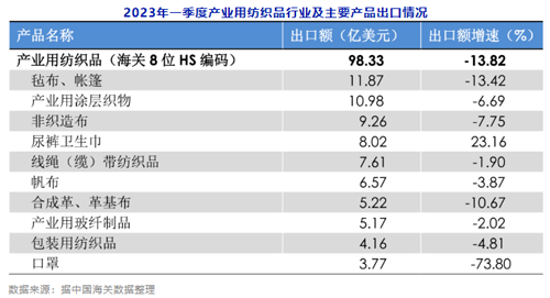 國(guó)際貿(mào)易方面,根據(jù)中國(guó)海關(guān)數(shù)據(jù),2023年一季度我國(guó)產(chǎn)業(yè)用紡織品行業(yè)的出口額(海關(guān)8位HS編碼統(tǒng)計(jì)數(shù)據(jù))為98.3億美元,同比下降13.8%;一季度行業(yè)進(jìn)口額(海關(guān)8位HS編碼統(tǒng)計(jì)數(shù)據(jù))為12.3億美元,同比下降17.7%。分產(chǎn)品來(lái)看,在出口前十的產(chǎn)品中,氈布/帳篷和產(chǎn)業(yè)用涂層織物的出口額均超過(guò)10億美元;非織造布出口量為29.3萬(wàn)噸,同比下降2.8%,價(jià)值9.3億美元,同比下降7.8%;一次性衛(wèi)生用品的海外需求持續(xù)旺盛,出口額為8億美元,同比增長(zhǎng)23.2%;線繩(纜)帶紡織品、帆布、革基布等傳統(tǒng)產(chǎn)品的需求轉(zhuǎn)弱,出口額分別同比下降1.9%、3.9%、10.7%;口罩與化纖非織造布制防護(hù)服(含醫(yī)用防護(hù)服)的出口額分別同比下降73.8%和32.2%。